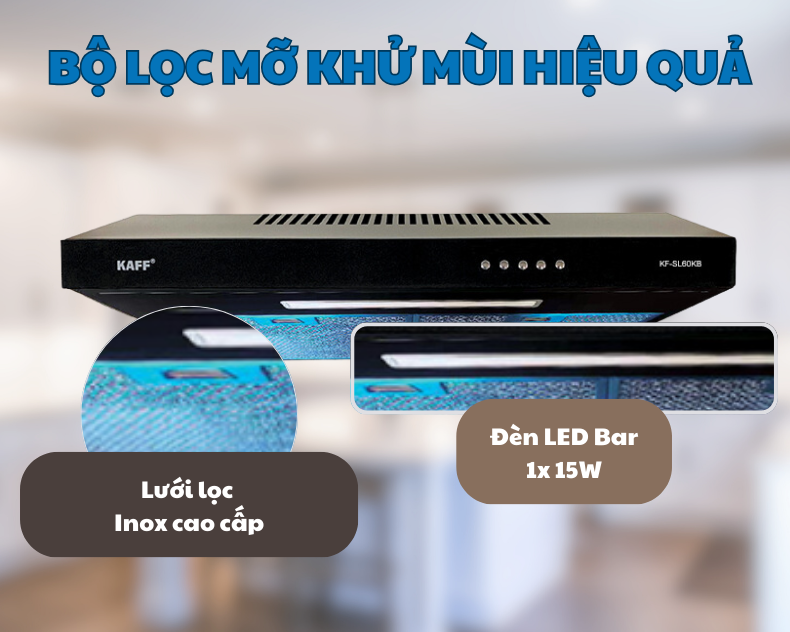Máy hút mùi Kaff KF-SL60KB là dòng máy hút mùi cổ điển điều khiển phím bấm với công suất hút 700m3/h và với 3 mức tốc độ hút khác nhau tuỳ vào lượng mùi, lượng khói mà người sử dụng có thể chọn lựa mức độ phù hợp, làm sạch mùi khói, mùi thức ăn hiệu quả.