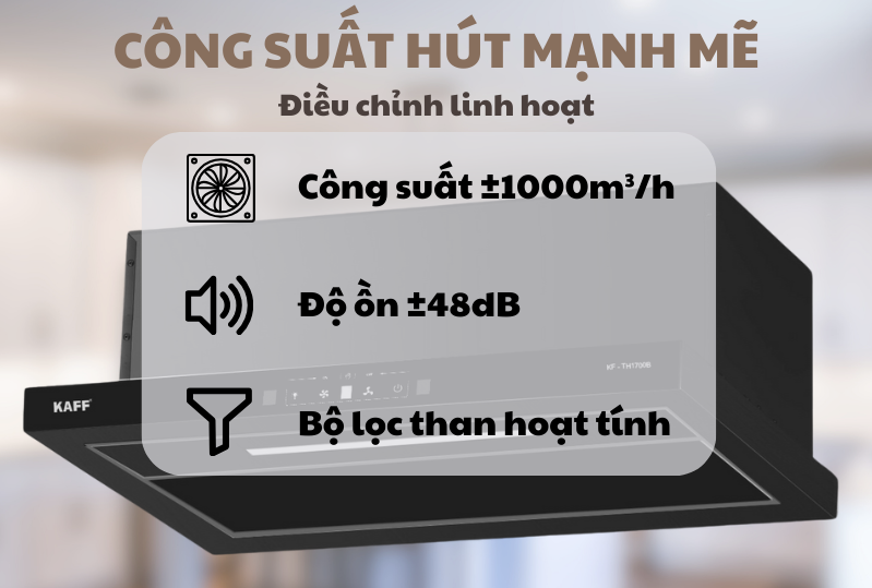 Trang bị động cơ Turbo 1x130W mạnh mẽ, máy hút mùi Kaff KF-TH1700B sở hữu công suất hút tối đa lên đến 1000 m³/h, nhanh chóng loại bỏ hoàn toàn khói, mùi thức ăn, dầu mỡ và các tác nhân gây hại khác, trả lại bầu không khí trong lành cho căn bếp của bạn. Độ ồn tối đa chỉ 48dB, đảm bảo không gian yên tĩnh, thoải mái cho bạn và gia đình.