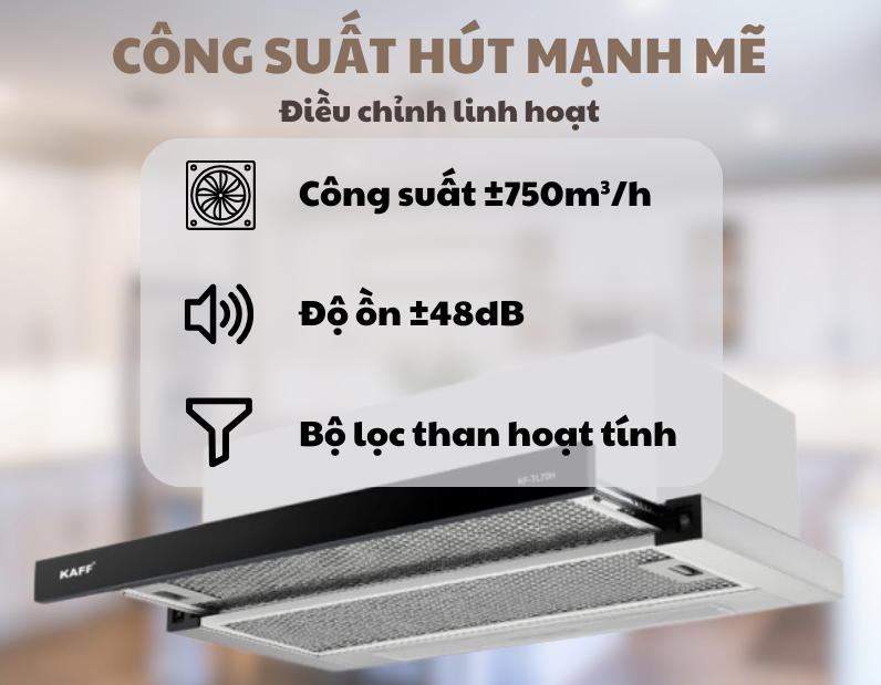 Máy hút mùi Kaff KF-TL90H được thiết kế với thân máy bằng thép phủ sơn tĩnh điện chống gỉ tạo độ bền cao cho máy, kiểu dáng sang trọng với kích thước 90cm phù hợp với nhiều không gian bếp Việt. Đây là loại máy hút mùi có công suất cao trong các loại máy hút mùi cổ điển, công suất tối đa của máy lên đến 750m3/h với 2 tốc độ hút khác nhau dễ dàng điều chỉnh bằng phím bấm điện tử.