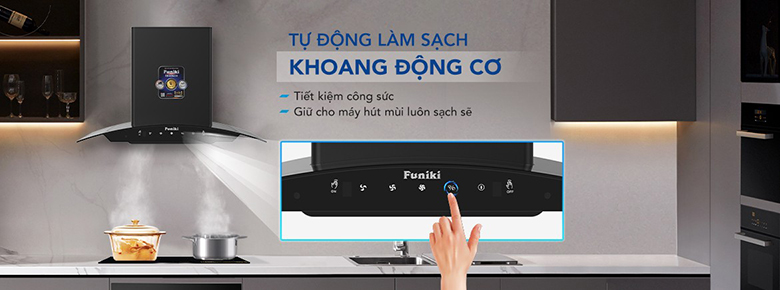 Funiki HKH9654 tích hợp chế độ tự động làm sạch khoang động cơ bằng nhiệt giúp tiết kiệm công sức và giữ cho máy hút mùi luôn sạch sẽ, loại bỏ dầu chỉ bằng một lần chạm.