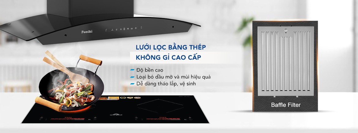 Bộ lọc vách ngăn được làm bằng thép không gỉ cao cấp, sáng bóng, dễ dàng cọ rửa dầu mỡ. Bộ lọc có tác dụng loại bỏ dầu mỡ và các hạt bụi lớn từ không khí giúp bảo vệ động cơ, ngăn chặn tắc nghẽn nhằm đảm bảo hiệu quả hút không bị thuyên giảm.