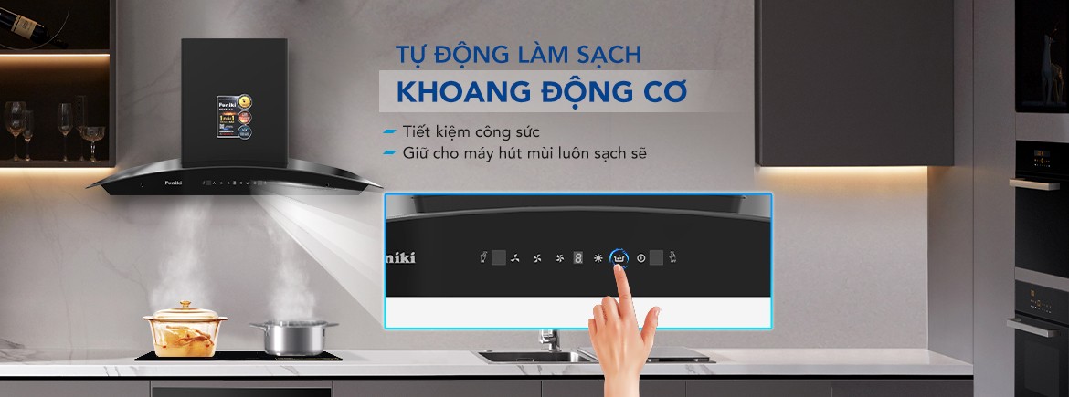 Không những vậy, máy còn có chức năng tự động làm sạch bằng nhiệt giúp tiết kiệm công sức và giữ cho máy hút mùi luôn sạch sẽ, loại bỏ dầu chỉ bằng một lần chạm.
