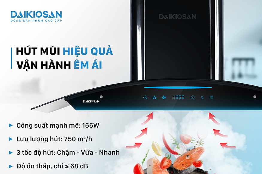 Máy hút mùi Daikiosan DKH-000001 có công suất 155W, cho lưu lượng hút đạt 750m3/h, giúp hút bay mọi loại ám mùi thức ăn, khói nấu và mùi dầu mỡ ra khỏi gian bếp.