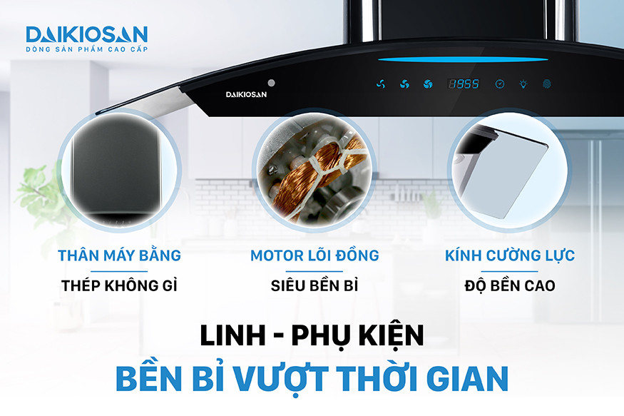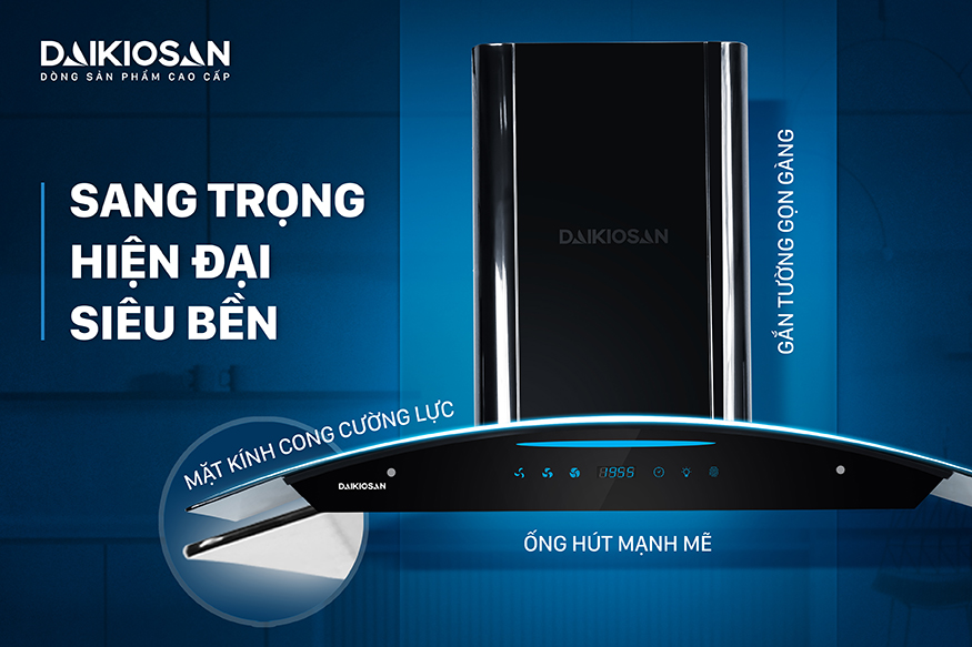 Không chỉ bền từ thân máy bên trong, máy hút mùi Daikiosan DKH-000001 còn sở hữu mặt kính cường lực sang trọng, tạo nên sự chắc chắn và sáng bóng đẹp mắt.Quý khách muốn mua được sản phẩm, máy hút mùi Daikiosan kính cong, máy hút mùi kính thẳng hay máy hút mùi chính hãng hãy liên hệ thông qua Hotline: 1900 63 60 98 để được tư vấn trực tiếp.