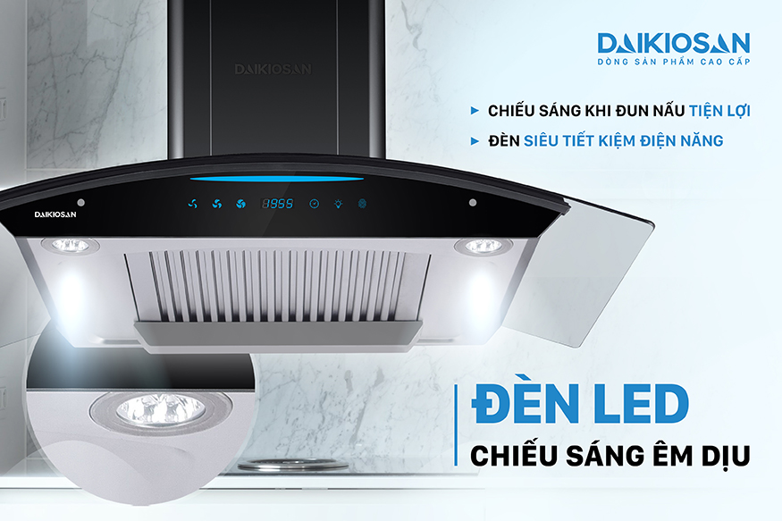 Hệ thống chiếu sáng của máy hút mùi Daikiosan DKH-000001 sẽ cung cấp nguồn sáng êm dịu, tạo điều kiện tốt nhất cho người nội trợ nấu nướng với tầm nhìn sáng sủa, dễ dàng thao tác khi chế biến món ăn.
