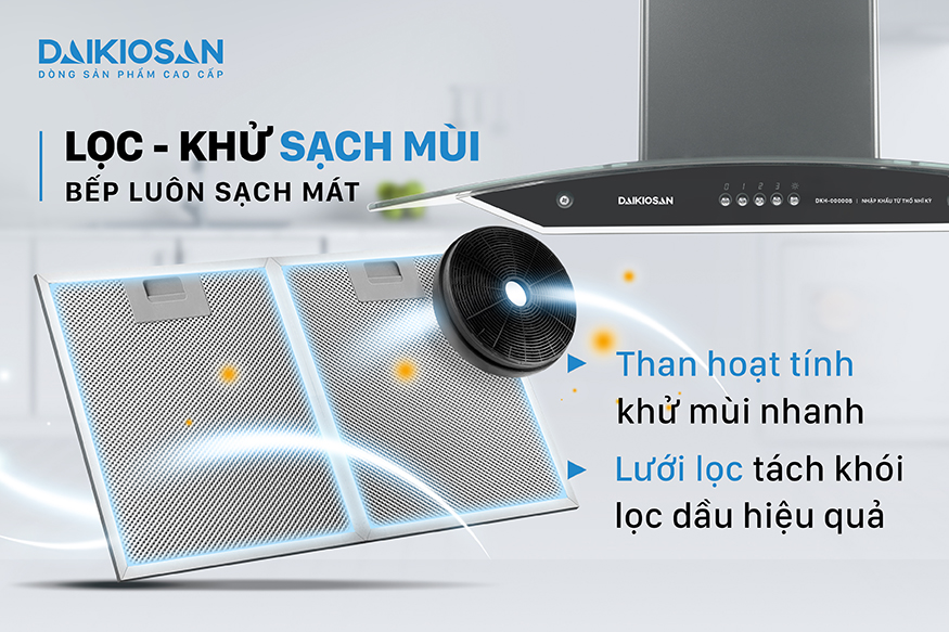 Nhờ được trang bị 2 hộp lọc bằng than hoạt tính nằm phía trước động cơ, máy hút mùi Daikiosan DKH-000008 có khả năng tách khói lọc dầu, khử bỏ mùi thức ăn dư thừa một cách an toàn, bảo vệ sức khỏe cho các thành viên trong gia đình.