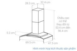 – Chiều ngang 69.5 cm có thể hút mùi hiệu quả cho bếp có 2 vùng nấu.