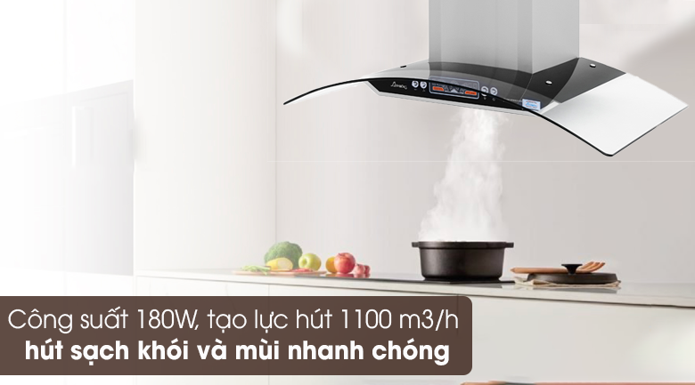 Máy hút mùi áp tường được trang bị động cơ công suất 180W, tạo lực hút mạnh mẽ đến 1100 m3/h, hút sạch khói mùi nhanh chóng