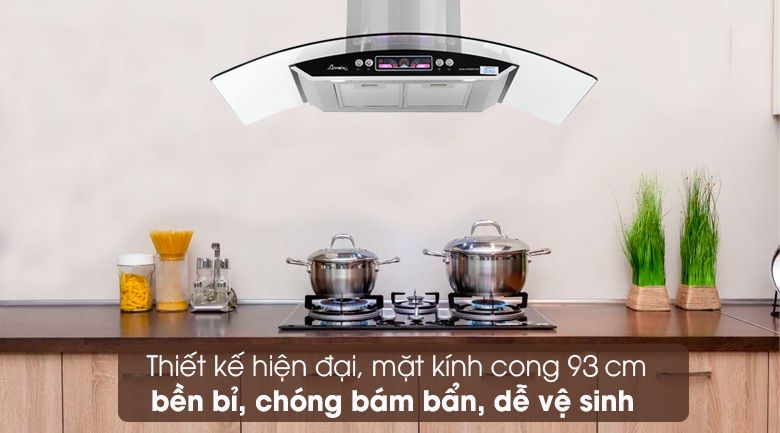 Máy hút mùi Apex thiết kế với mặt kính cong 93 cm giúp gom khói mùi, phù hợp với cả những căn bếp truyền thống và hiện đại, tăng tính thẩm mỹ cho ngôi nhà