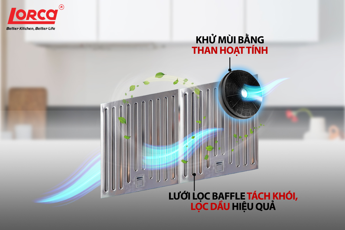 Hệ thống lọc khử mùi bằng than hoạt tính có tác dụng khử mùi, lọc không khí tạo ra không khí trong lành và sạch sẽ lên đến 99% trong không gian bếp.