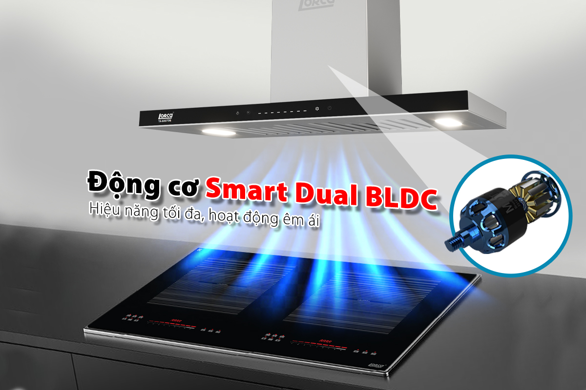 Máy hút mùi TA-6007TM trang bị mô-tơ BLDC hoạt động ổn định với công suất 100W với công suất hút 1300m³/h giúp việc khử mùi được tốt hơn, hỗ trợ tạo luồng gió mới cho căn bếp của gia đình.