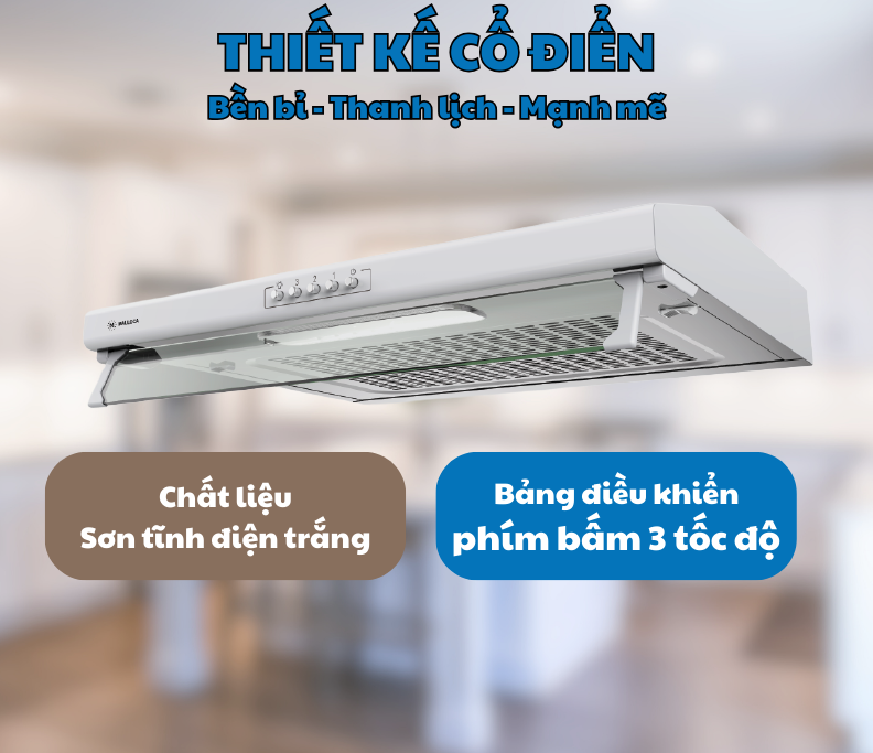 Máy hút mùi Malloca H107W có thiết kế cổ điển với chất liệu sơn tĩnh điện trắng, tạo nên vẻ ngoài sang trọng và dễ dàng hòa vào mọi không gian nội thất. Sản phẩm không chỉ mang lại sự tiện lợi mà còn làm tăng thẩm mỹ cho không gian bếp của bạn.