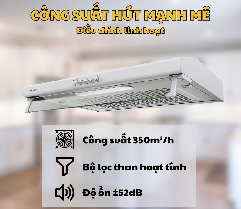 Với công suất hút lên tới 350 m³/h, Malloca H107W đảm bảo khả năng thông gió và khử mùi hiệu quả. Độ ồn hoạt động dưới 52 dB giúp bạn có thể sử dụng máy mà không lo ngại về tiếng ồn gây khó chịu.
