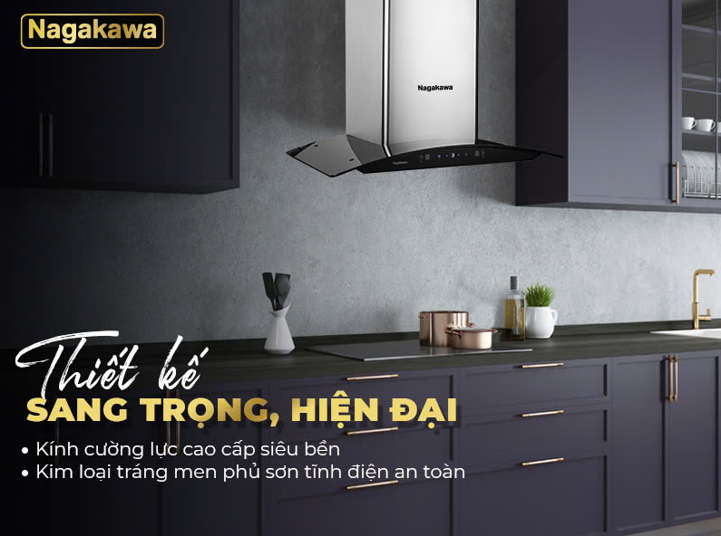 Máy hút mùi cao cấp Nagakawa NAG1853-70CM làm từ kính cường lực cao cấp siêu bền cùng chất liệu kim loại tráng men phủ lớp sơn tĩnh điện đảm bảo an toàn cho người sử dụng.