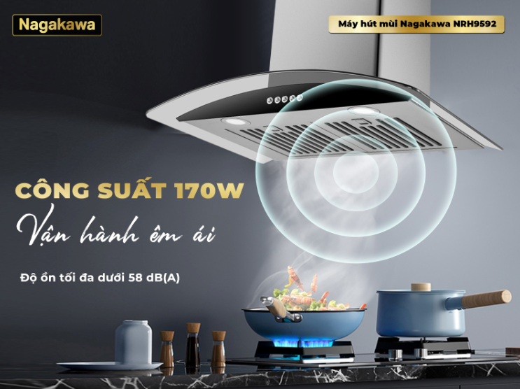Máy hút mùi NRH9592 với công suất hiệu quả 170W, đảm bảo khả năng hoạt động mạnh mẽ đồng thời vẫn giảm chi phí năng lượng, tiết kiệm điện so với nhiều thiết bị khác. Với độ ồn tối đa dưới 58 dB(A), máy vận hành êm ái, giúp kiểm soát tiếng ồn tối ưu, mang lại không gian nấu nướng yên tĩnh và thư thái, không còn lo lắng về sự khó chịu do tiếng động như các thiết bị khác.