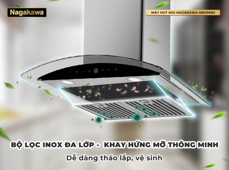 Khay hứng mỡ thông minh của Máy hút mùi Nagakawa NRH9593 được thiết kế dễ dàng tháo rời và vệ sinh, giúp bạn loại bỏ dầu mỡ thừa một cách nhanh chóng và tiện lợi, giữ căn bếp luôn sạch sẽ và gọn gàng.