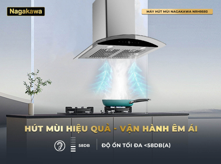 Độ ồn tối đa của Máy hút mùi Nagakawa NRH9593 chỉ < 58 dB(A), hoạt động êm ái, không gây tiếng ồn khó chịu, mang đến không gian bếp yên tĩnh và thoải mái.
