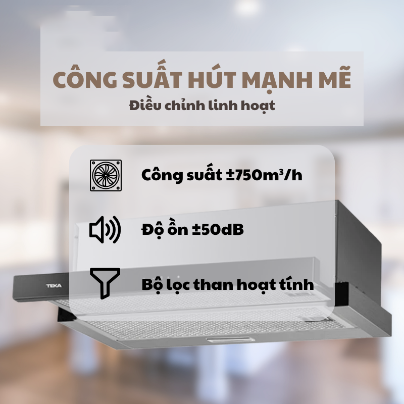 Máy có công suất hút là 750m3/h và 3 mức công suất hút khác nhau nên tuỳ vào lượng thực phẩm nấu hàng ngày mà người sử dụng có thể chọn lựa mức độ phù hợp, làm sạch mùi thức ăn hiệu quả. Độ ồn tối đa của máy khi hoạt động với công suất cao nhất là ở mức 50 dB, không làm ảnh hưởng đến sinh hoạt của các thành viên trong gia đình.