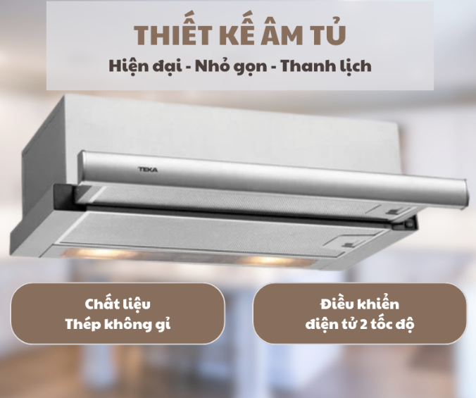 Điểm nổi bật của Teka EASY TL 7310 INOX chính là thiết kế âm tủ dạng kéo. Với khả năng ẩn mình hoàn toàn trong tủ bếp, sản phẩm không chỉ tiết kiệm tối đa diện tích mà còn mang đến vẻ đẹp liền mạch, hiện đại cho không gian bếp. Mặt trước của máy được làm từ chất liệu thép không gỉ cao cấp, không chỉ bền bỉ mà còn dễ dàng vệ sinh, giúp giữ cho căn bếp luôn sáng bóng. Đặc biệt, mặt nạ phía trước có thể thay thế được, giúp bạn dễ dàng tùy biến diện mạo của máy hút mùi để phù hợp với phong cách thiết kế của tủ bếp.