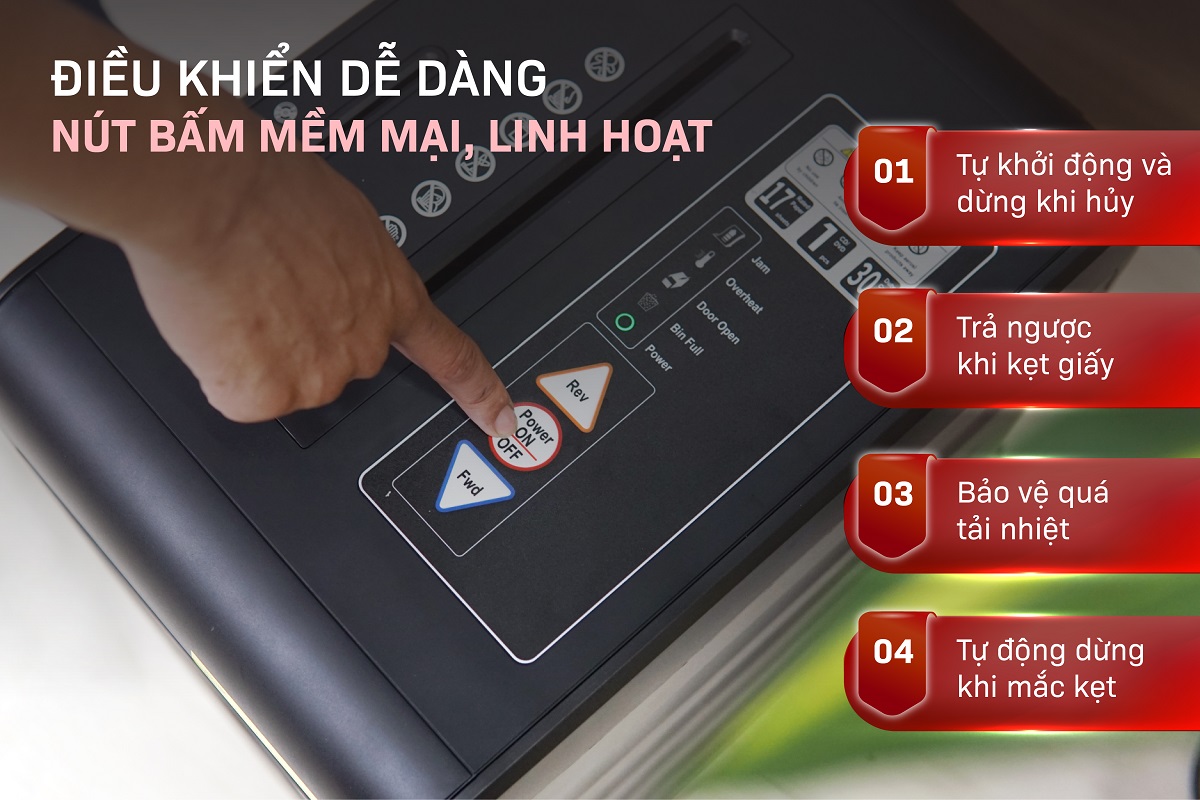 Máy hủy tài liệu có chức năng tự dừng lại khi bị kẹt giấy; Tự khởi động, tắt máy khi hủy tài liệu xong. Ngoài ra máy có tính năng bảo vệ quá tải đảm bảo độ bền cho mô tơ, báo thùng rác đầy.