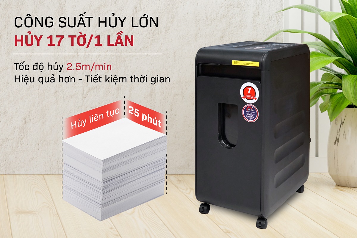 Máy hủy tài liệu Silicon có công suất hủy tờ A4 với định lượng giấy 70g tờ đạt 17 tờ/1 lần, thời gian hủy 25 phút.