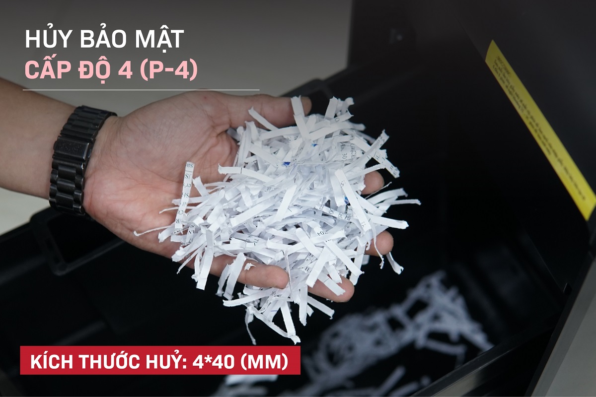 Máy có kiểu hủy vụn với kích thước hủy chỉ còn 4mm x 40mm. Máy sử dụng mô tơ cảm ứng bền bỉ, độ ồn dưới 52dB.