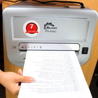 Trong số các sản phẩm máy hủy tài liệu, chiếc Silicon PS-836C được đánh giá là một trong những sản phẩm có thiết kế màu đen sang trọng, có khả năng hủy được các loại giấy, CD/DVD, thẻ tín dụng, ghim cài, ghim bấm và đặc biệt là khả năng hủy liên tục tới 17 tờ/lượt hủy. Đây là một chiếc máy hủy với đầy đủ những tính năng tiêu biểu của thương hiệu Silicon, phù hợp với nhiều văn phòng, ngân hàng hay các cơ quan nhà nước… có quy mô vừa và nhỏ.