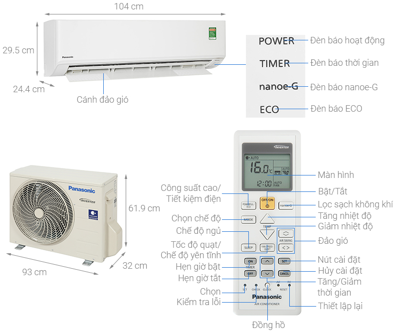 • Kích thước - Khối lượng dàn lạnh: Dài 104 cm - Cao 29.5 cm - Dày 24.4 cm - Nặng 12 kg