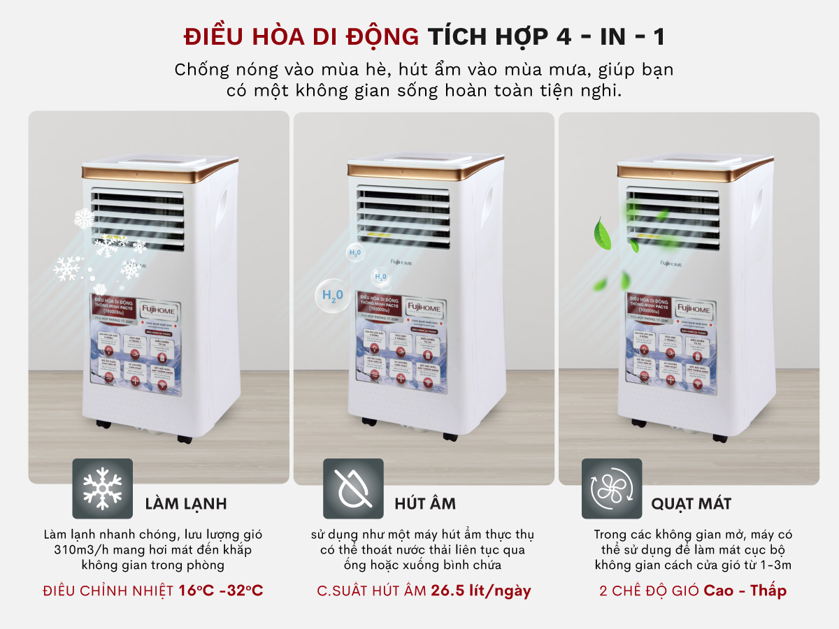 Chiếc máy điều hòa di động này của thương hiệu Fujihome sở hữu 4 tính năng trong cùng 1 sản phẩm:
