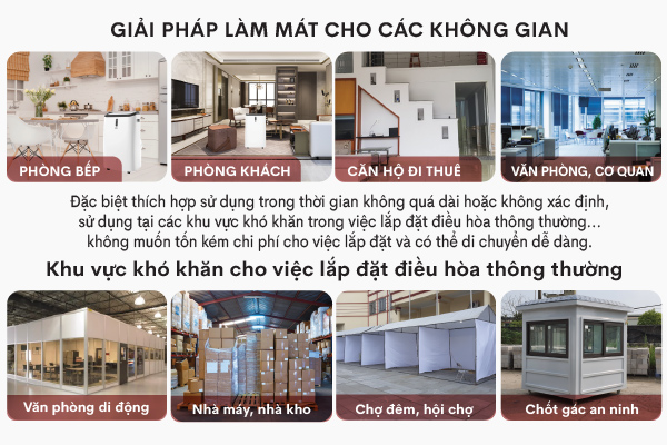 Trong các không gian không kín hoàn toàn, máy vẫn có thể sử dụng để làm mát cục bộ cho người ngồi phía trước máy cách cửa gió từ 1-3m.