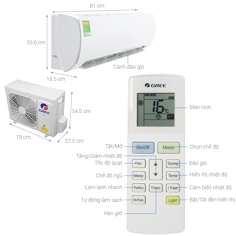 Thông tin cục nóng:Dài 78 cm – Cao 54.5 cm – Dày 27.5 cm – Nặng 27.5 kg