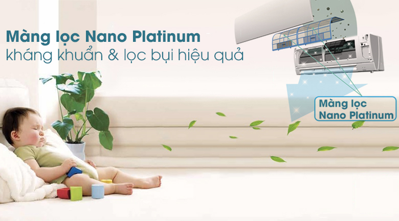 Mọi bụi bẩn và mùi hôi mốc khó chịu sẽ bị loại bỏ hoàn toàn nhờ màng lọc Nano Platinum hiện đại của chiếc máy lạnh này. Giờ đây bầu không khí của gia đình bạn luôn được trong lành.