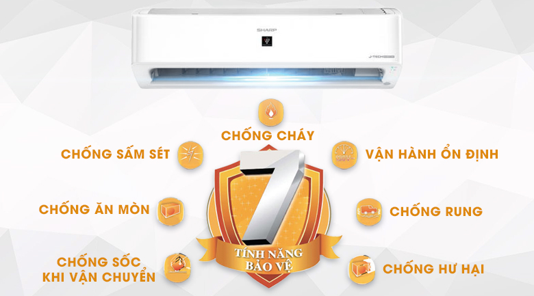 Dòng máy lạnh J-Tech Inverter được trang bị 7 tính năng bảo vệ gồm: chống cháy, chống ăn mòn, chống sấm sét, chống sốc, chống hư hại do mưa gió, chống rung và vận hành ổn định.