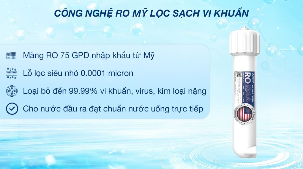 – Công nghệ lọc RO thẩm thấu ngược: loại bỏ tạp chất, vi khuẩn, kim loại nặng, cung cấp nước tinh khiết đạt chuẩn.