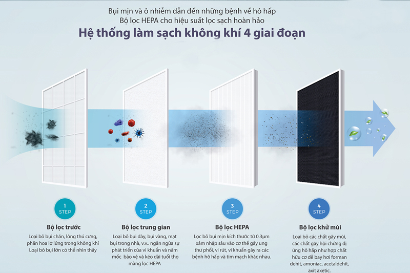 - Hệ thống lọc không khí 4 bước sử dụng lõi lọc cao cấp công nghệ mới cho không khí sạch sẽ, trong lành lơn.