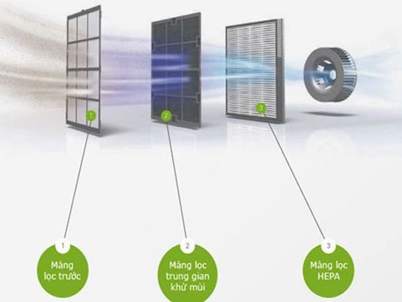 Máy lọc không khí được trang bị 3 màng lọc giúp loại bỏ sạch sẽ bụi bẩn, nấm mốc, vi khuẩn, lông thú nuôi, mùi khó chiụ, độc hại.