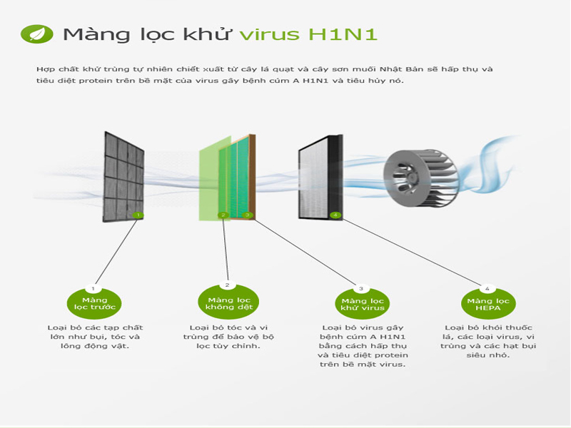 Máy có hệ thống 4 màng lọc, có khả năng loại bỏ virus gây cúm A H1N1, bằng cách hấp thụ và tiêu diệt protein trên bề mặt virus, giúp không khí gia đình luôn an toàn.