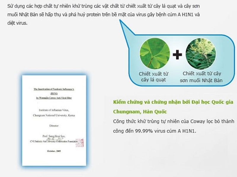 Máy sử dụng các hợp chất tự nhiên, khử trùng các vật chất từ chiết xuất cây lá quạt và cây sơn muối Nhật Bản sẽ hấp thụ và phá hủy protein trên bề mặt virus gây bệnh cúm A H1N1 và diệt virus.