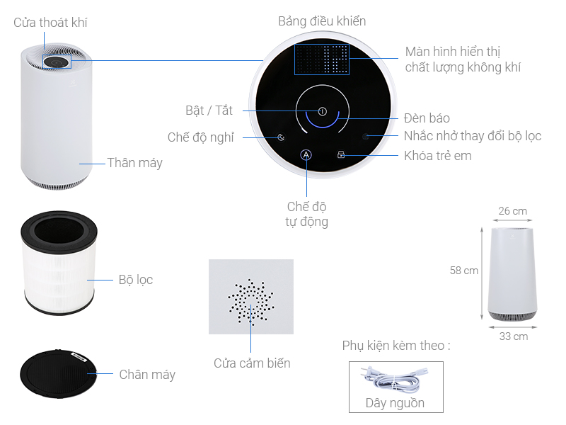 • Tiện ích: Cảnh báo thay bộ lọc Đèn báo chất lượng không khí Đèn báo hoạt động Khoá trẻ em Bảng điều khiển cảm ứng