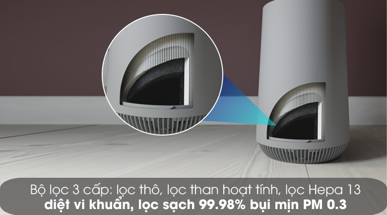 3 lớp lọc làm sạch hiệu quả không gian phòng: lọc thô, lọc than hoạt tính, lọc HEPA 13
