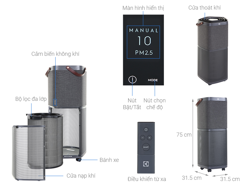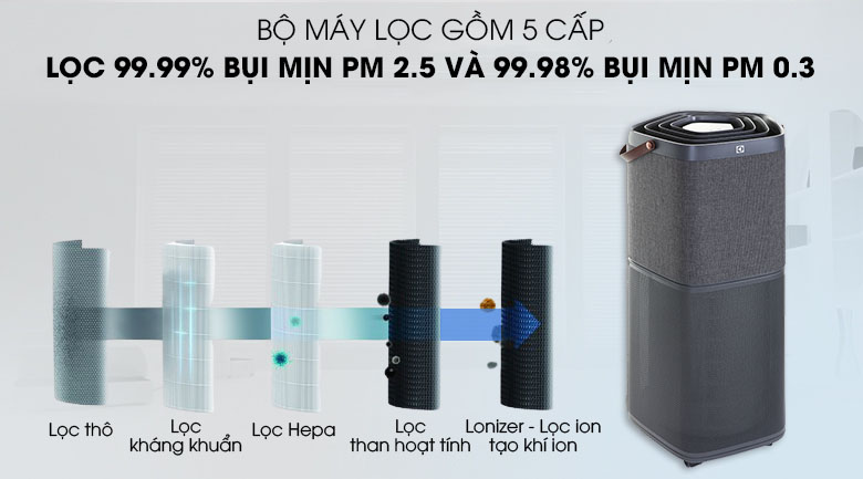 Bộ máy lọc không khí bao gồm 5 cấp lọc giúp lọc 99.99% bụi mịn PM2.5 và 99.98% bụi mịn PM0.3