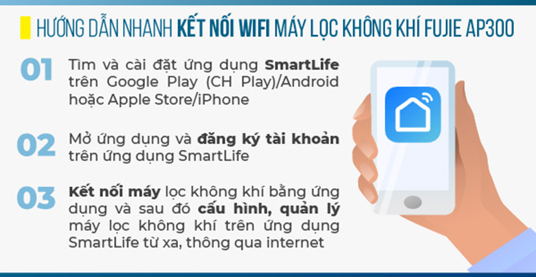 Ứng dụng SmartLife giúp bạn dễ dàng kết nối điện thoại thông minh với máy lọc không khí FujiE AP300 để điều khiển bật/tắt, điều chỉnh chế độ hoạt động. Bên cạnh đó, bạn còn có thể theo dõi chất lượng không khí ngay trên điện thoại vô cùng tiện lợi.