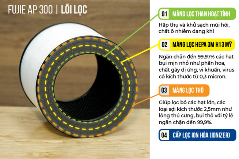– Bộ lọc HEPA 3M H13 của Mỹ: Loại bỏ các chất gây dị ứng và vi khuẩn trong luồng không khí, như các hạt, chất gây dị ứng, phấn hoa, bụi, khói và vi rút. Màng lọc HEPA kết hợp quạt tốc độ cao để đẩy nhanh tốc độ hấp thụ các hạt có kích thước lớn hơn 0,3 micron lên tới 99,97%.