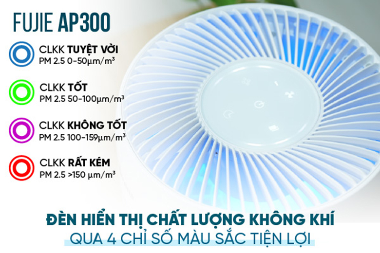 Đèn led hiển thị chất lượng của không khí qua màu sắc đẹp mắt, giúp người dùng dễ dàng nhận biết chất lượng không khí và điều chỉnh mức độ quạt gió để lọc không khí cho phù hợp. Ngoài ra, máy lọc không khí FujiE AP300 còn có đèn hiển thị nhắc nhở thay thế màng lọc kịp thời, đảm bảo hiệu quả hoạt động, kéo dài tuổi thọ của máy.