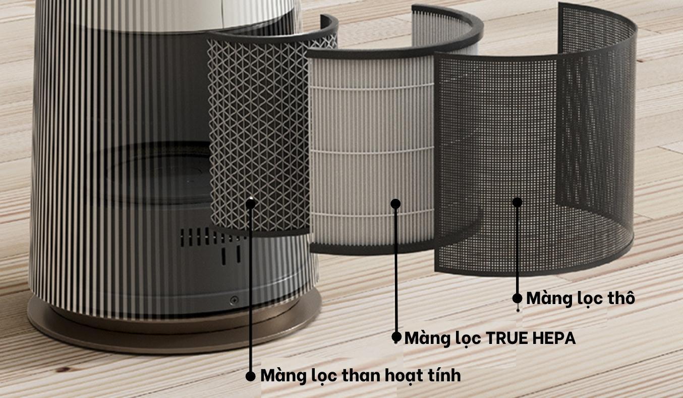 Máy được trang bị bộ lọc 3 lớp bao gồm: màng lọc thô, màng lọc TRUE HEPA và màng lọc than hoạt tính. Từ đó, máy giúp loại bỏ bụi mịn ở nhiều kích thước như PM10, PM2.5, PM1.0, PM0.3, cho bầu không khí trong lành. Cụ thể, màng lọc thô nhận nhiệm vụ lọc các hạt có kích thước lớn trong không khí như bụi bẩn, lông thú cưng,.. Sau đó, màng lọc TRUE HEPA 360° giúp loại bỏ bụi mịn có kích thước nhỏ đến 0.3 micron như khói, phấn hoa, vi trùng,… Cuối cùng, màng lọc than hoạt tính sẽ lọc khử mùi giúp loại bỏ các mùi khó chịu như khói thuốc lá, chất thải thực phẩm và các chất hóa học hòa lẫn trong không khí.