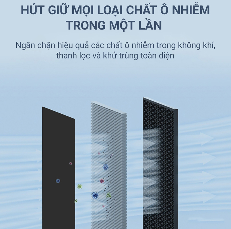 Hệ thống lọc được thiết kế gồm 3 lớp lọc tích hợp để tối ưu hiệu quả làm sạch không khí. Lớp lọc thô bên ngoài có chức năng giữ lại các hạt bụi lớn, lông tóc, các tạp chất có kích thước tương tự. Lớp lọc HEPA hấp thụ hiệu quả bụi mịn PM2.5, các hạt bụi lớn nhỏ. Cuối cùng, lưới than hoạt tính dạng tổ ong giúp giảm sức cản không khí, hấp thụ Formaldehyde, mùi hôi khó chịu.