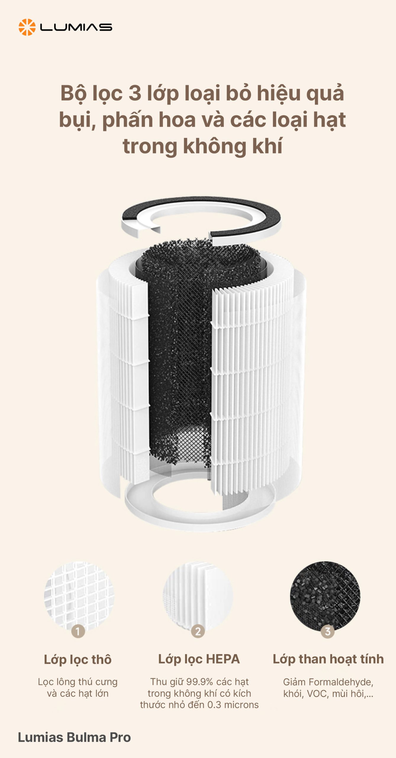 Để đảm bảo không khí trong lành, sạch sẽ an toàn cho sức khỏe, máy lọc Lumias Bulma Pro trang bị một hệ thống lọc không khí hiệu quả là vô cùng cần thiết. Thiết bị đã sử dụng một bộ lọc 3 lớp bao gồm lớp lọc thô, lớp lọc than hoạt tính và lớp lọc HEPA, trong đó: