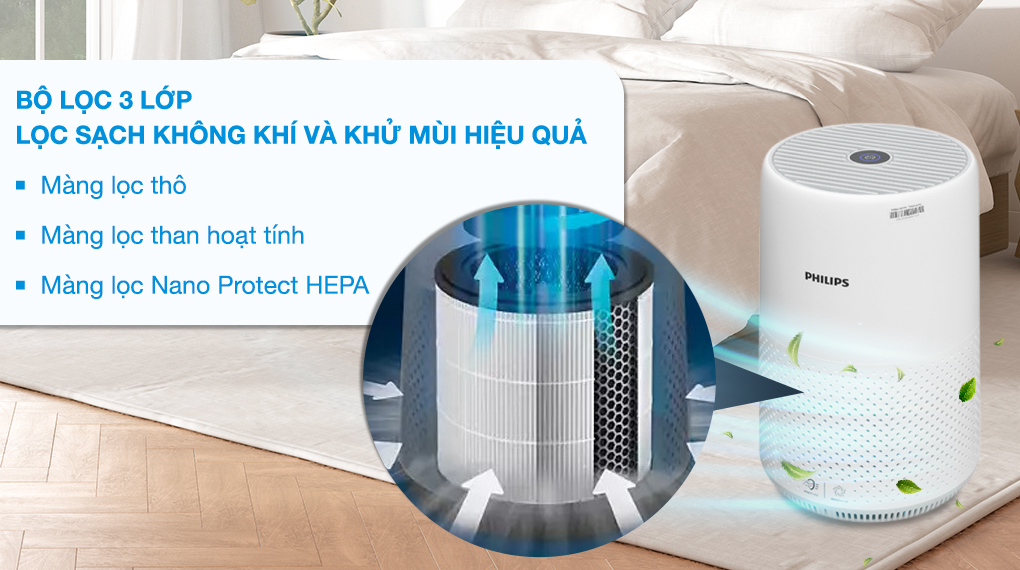 Máy lọc không khí Philips AC0850/20 thiết kế tinh tế, màu sắc trang nhã, phù hợp với nhiều không gian, lọc được bụi mịn PM2.5 và bụi siêu mịn PM0.003 với bộ lọc 3 lớp giúp không khí được lọc sạch hơn, mang lại không gian trong lành cho ngôi nhà của bạn.