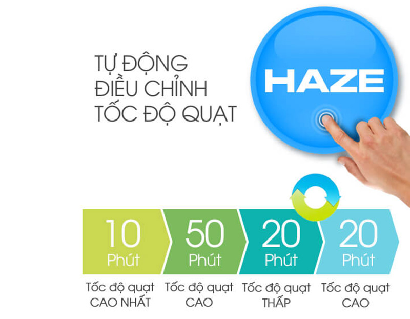Bên cạnh 3 cấp tốc độ quạt, chế độ Haze cho phép máy tự động vận hành quạt với tốc độ cao trong 60 phút đầu tiên. Sau đó hoạt động luân phiên giữa hai cấp độ thấp và cao trong vòng 20 phút kế tiếp để tăng hiệu năng lọc khí, nhanh chóng trả lại không gian thanh sạch nhất cho bạn và gia đình.