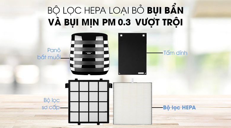 Bộ lọc bụi thô xử lý phân tử bởi có kích cỡ từ 500 micromet trở lên, bộ lọc HEPA lọc sạch các chất gây dị ứng, virus có kích cỡ 0.3 micromet, hạt bụi siêu nhỏ PM0.3.